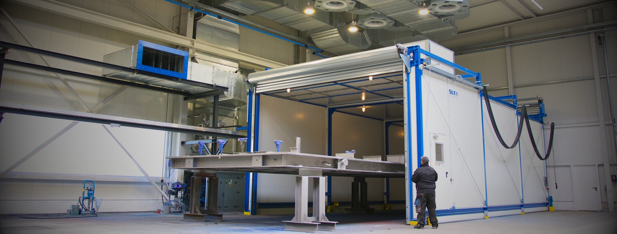 Nach dem Beschichten entfaltet sich der Teleskoptrockner über das zu trocknende Werkstück und dockt an das Zu- und Abluftsystem an. Nach dem Schließen des Rolltors startet der forcierte Trocknungsprozess bei Temperaturen bis zu 80 °C.